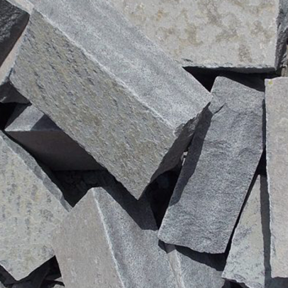 Pedra-basalto em formato de paralelepípedo, talhada para aplicação em calçamentos de ruas.